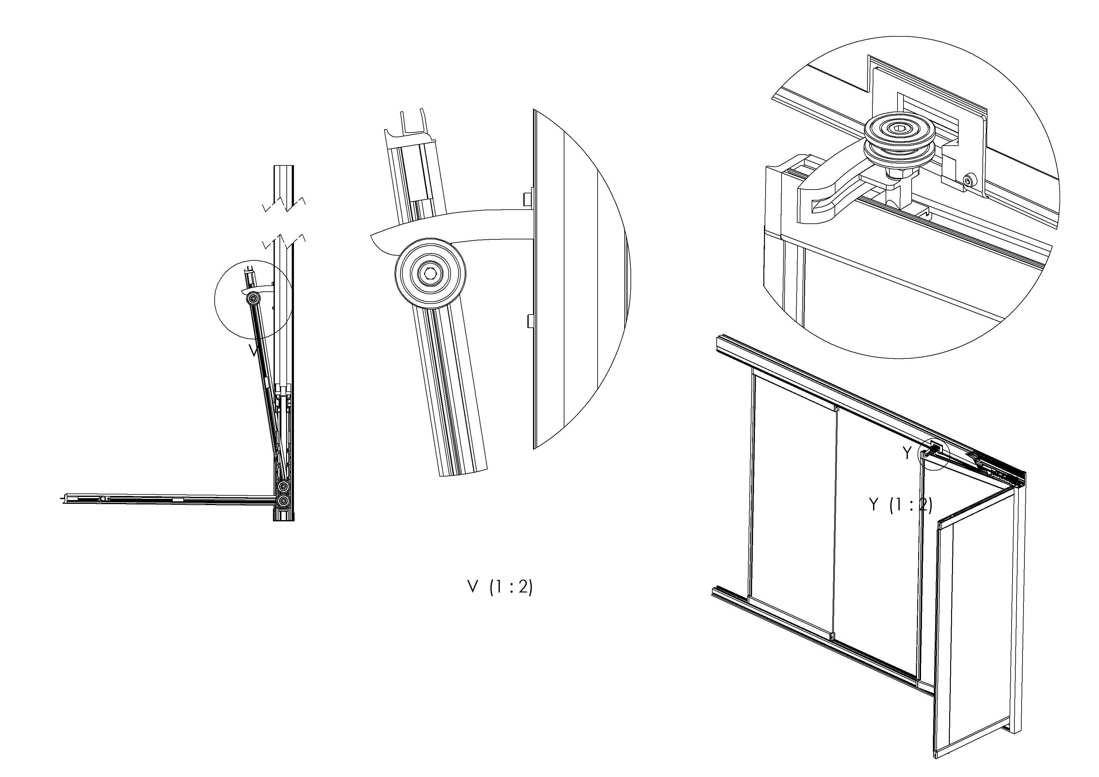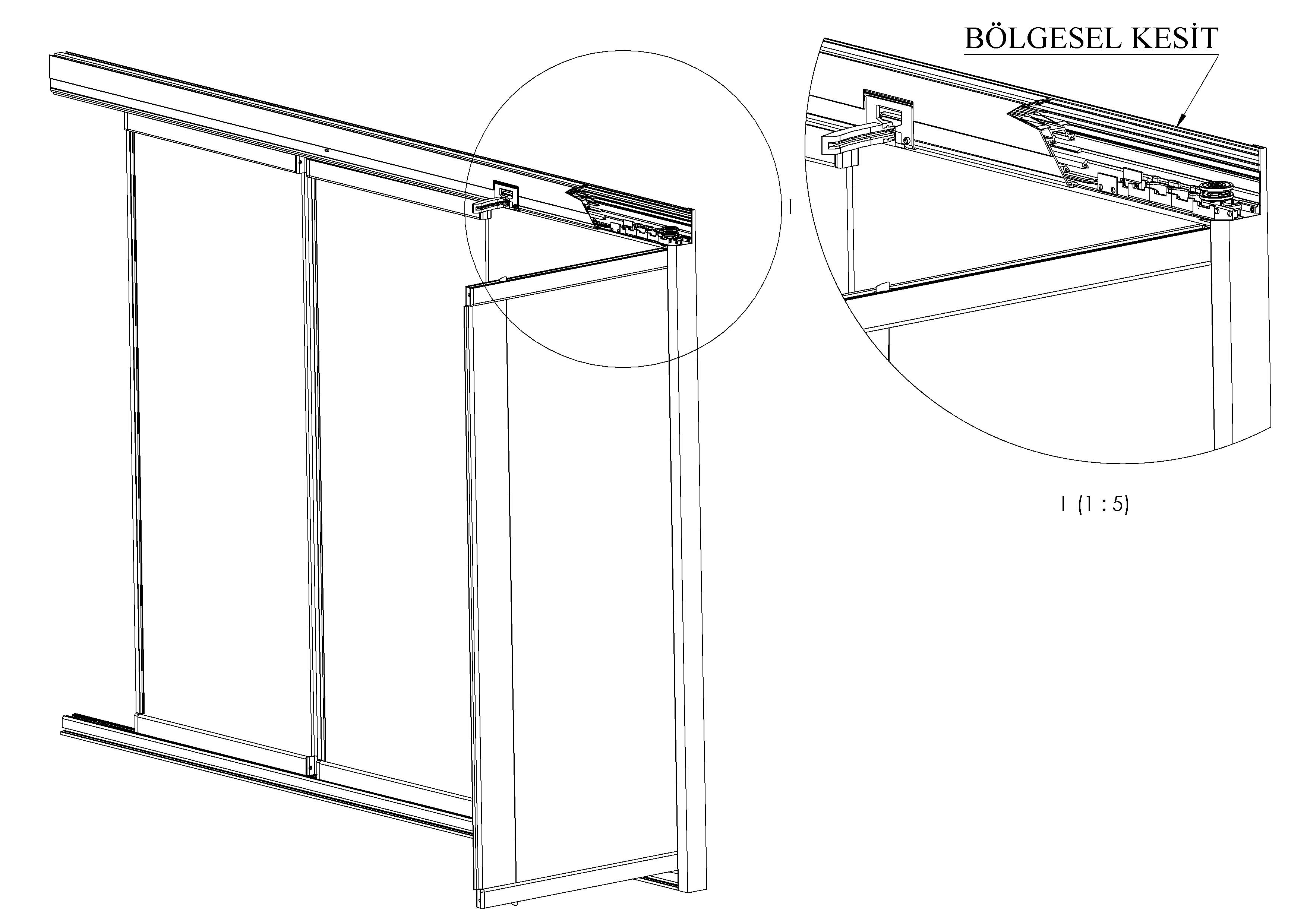 * Askılı ve makaslı sistemde , profillerin kenar bitim kapakları. Mevcut eşikli (alt profilli) malzeme kullanarak sistemi eşiksiz hale getiren kilit sistemi
